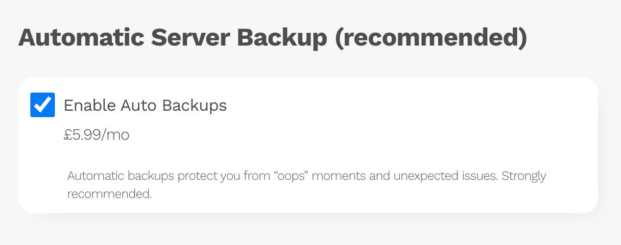 We recommend including a backup plan. Our auto-backup feature allows you to schedule complete server backups, including configurations. This ensures quick recovery in case of issues. Note: The monthly price varies based on server size.