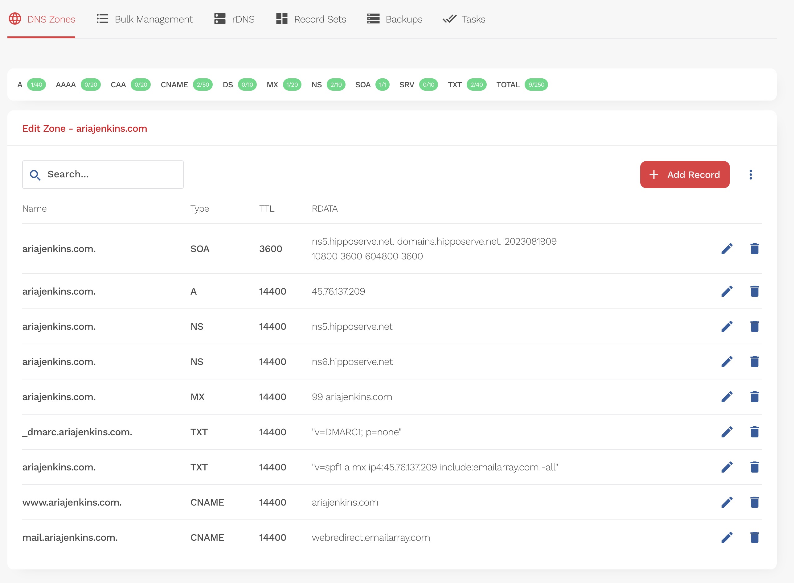 Your DNS Zone Management Screen