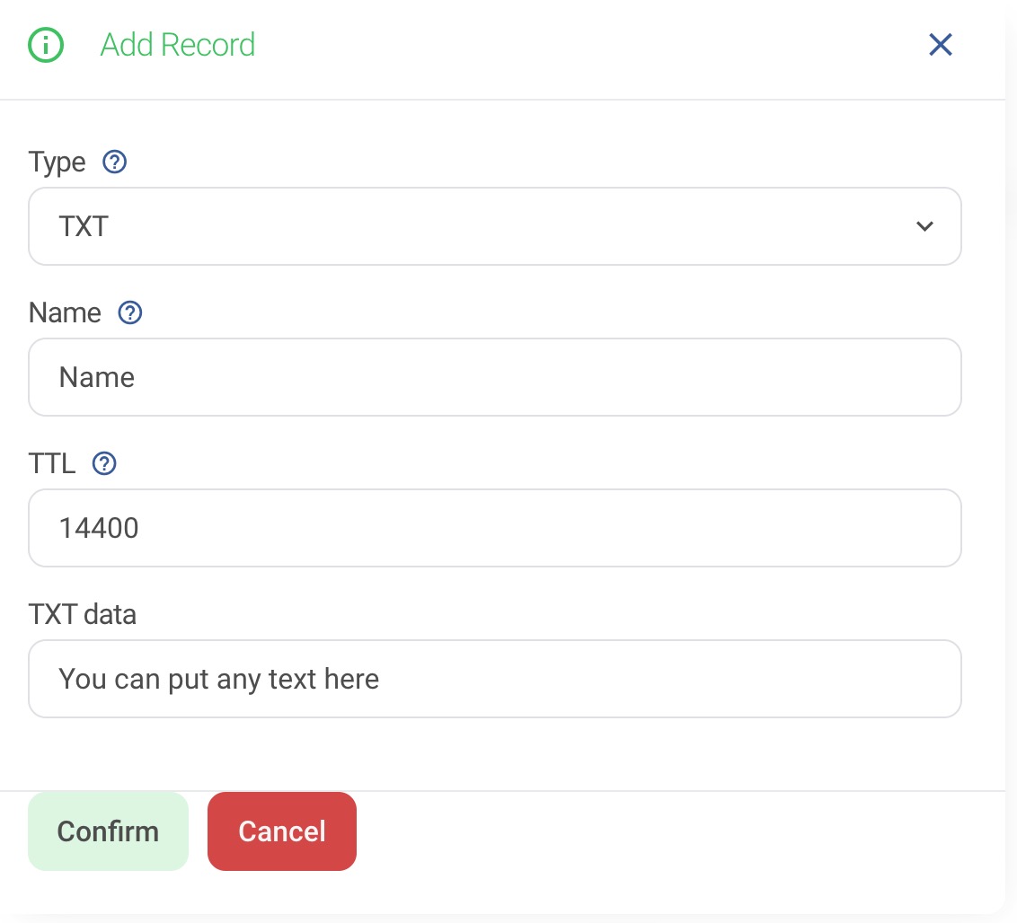 In this example, we'll add a TXT record, which is often used for domain verification (e.g., Google Search Console or Microsoft services).