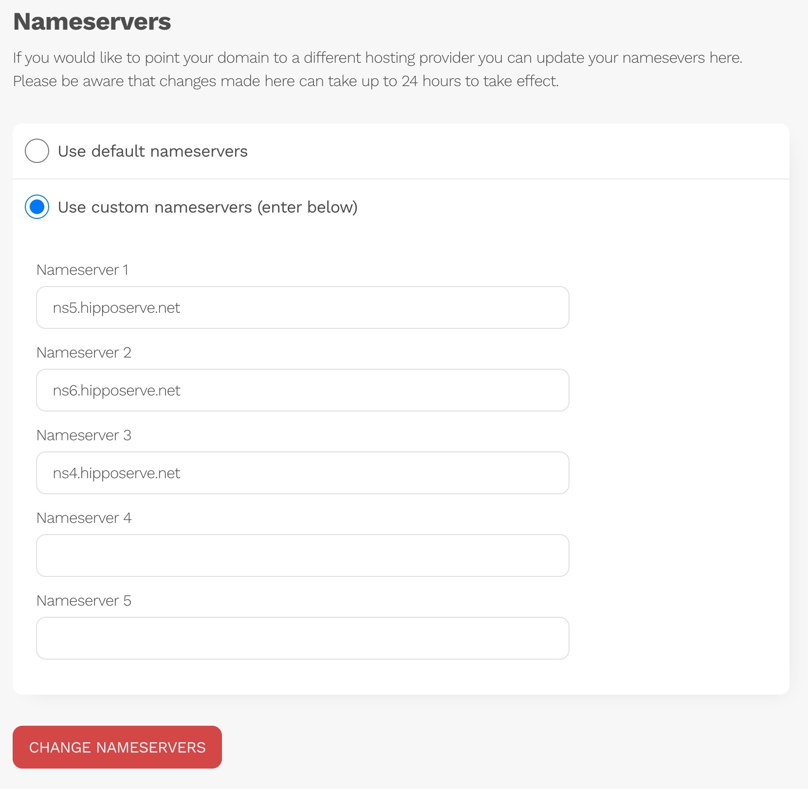 If your domain was registered directly with Hipposerve, there’s nothing you need to do. It will already be using our nameservers by default.