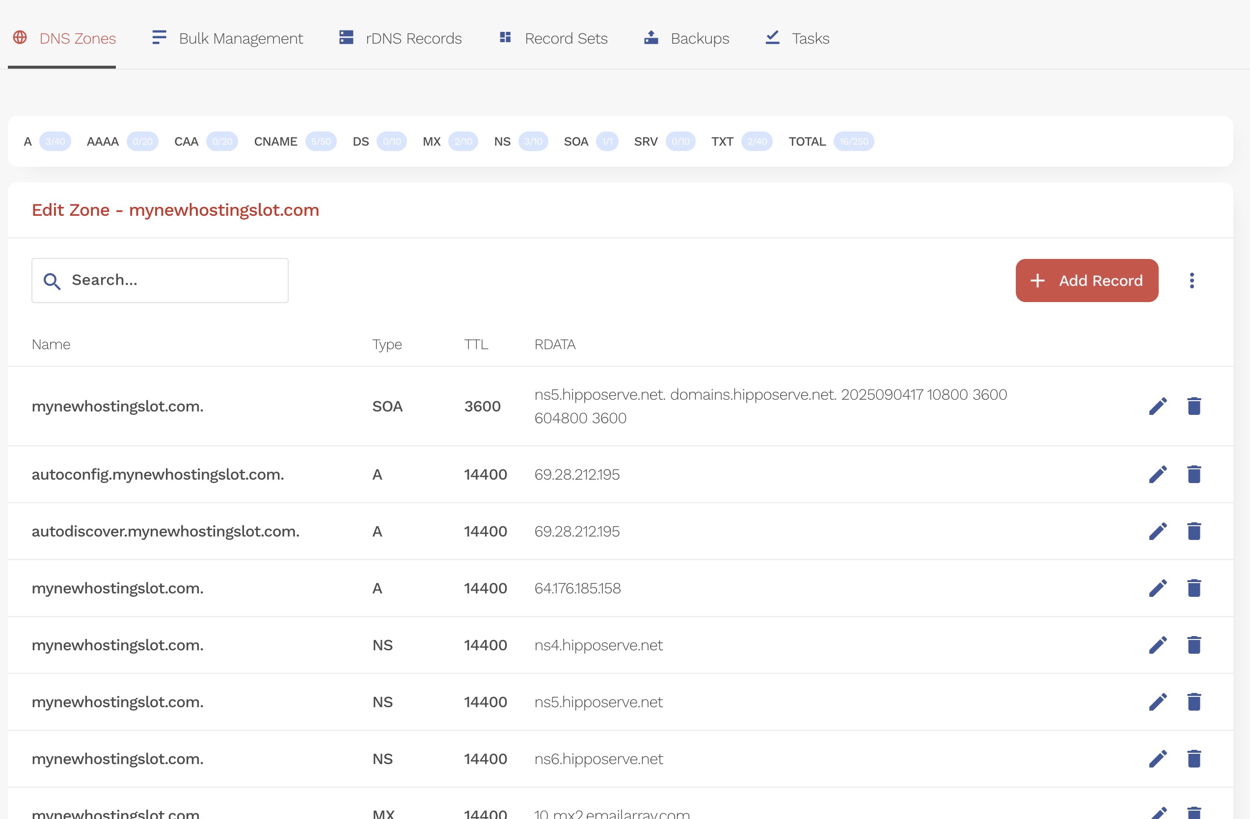 This will open the DNS records for the selected slot, where you can add, edit, or remove entries.