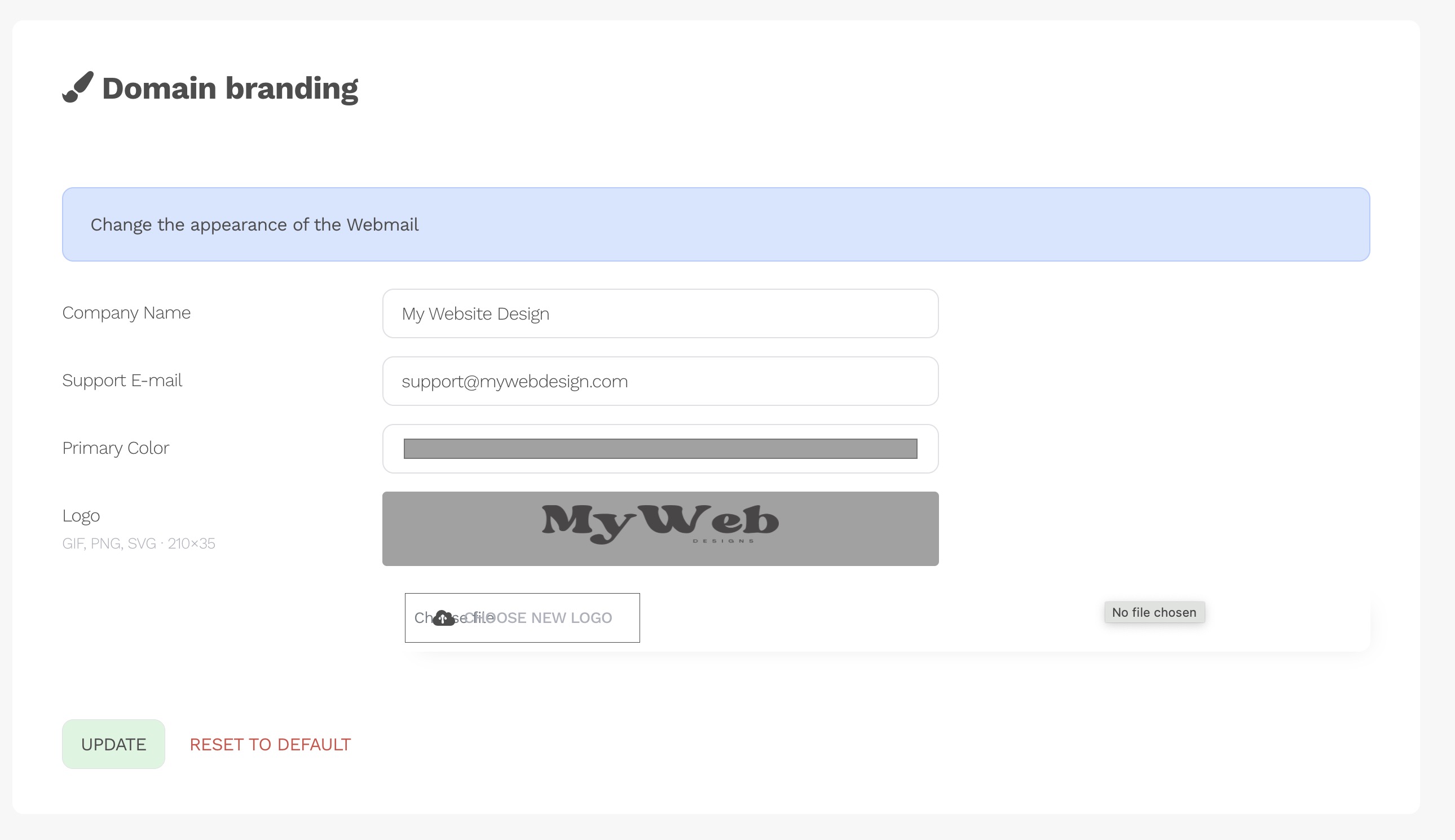 Është e mundur të personalizoni (white-label) Webmail-in tuaj për ta përputhur me identitetin e kompanisë ose organizatës suaj. Kjo është veçanërisht e dobishme për rishitësit që dëshirojnë ta paraqesin shërbimin nën markën e tyre.